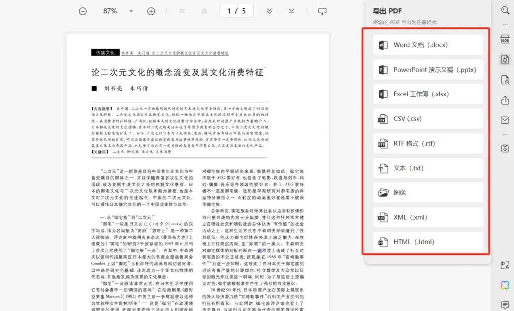 2、选择界面右侧“导出PDF”,点击“Word”格式;然后在Word中就可以进行目录添加。