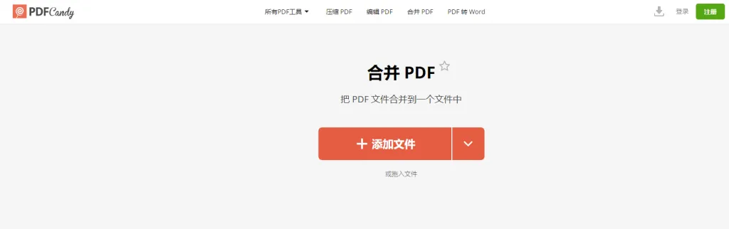 第1步,点击PDF Candy首页的“合并PDF”图标,进入合并操作页面;