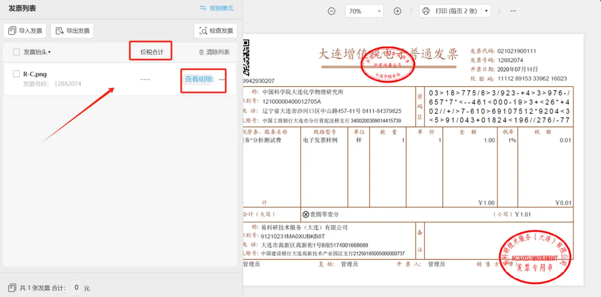 第二步:点击【价税合计】,即可得到发票金额,还可以点击【查看明细】获取发票详情;