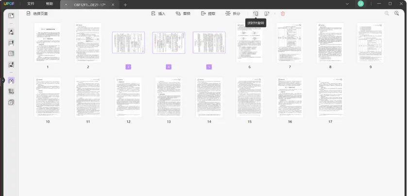 2、以“Ctrl+左键”的方式多选页面或“Shift+左键”的方式连选页面,根据需求,点击上方菜单栏中的“逆时针旋转”或“顺时针旋转”,调整后进行保存。
