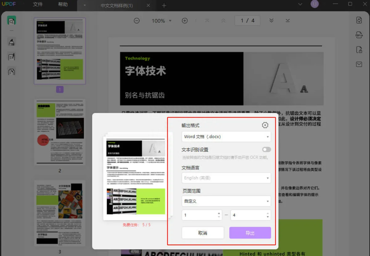 然后在弹出的窗口中,选择是否要启用“文本识别设置”和“页面范围”进行转换。