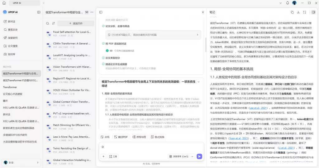 在这一阶段,将核心文献集中放在同一研究上下文中进行反复对比尤为重要。例如,借助 UPDF 的深度研究功能,围绕同一研究主题对多篇文献进行限定性提问,可以更高效地发现: