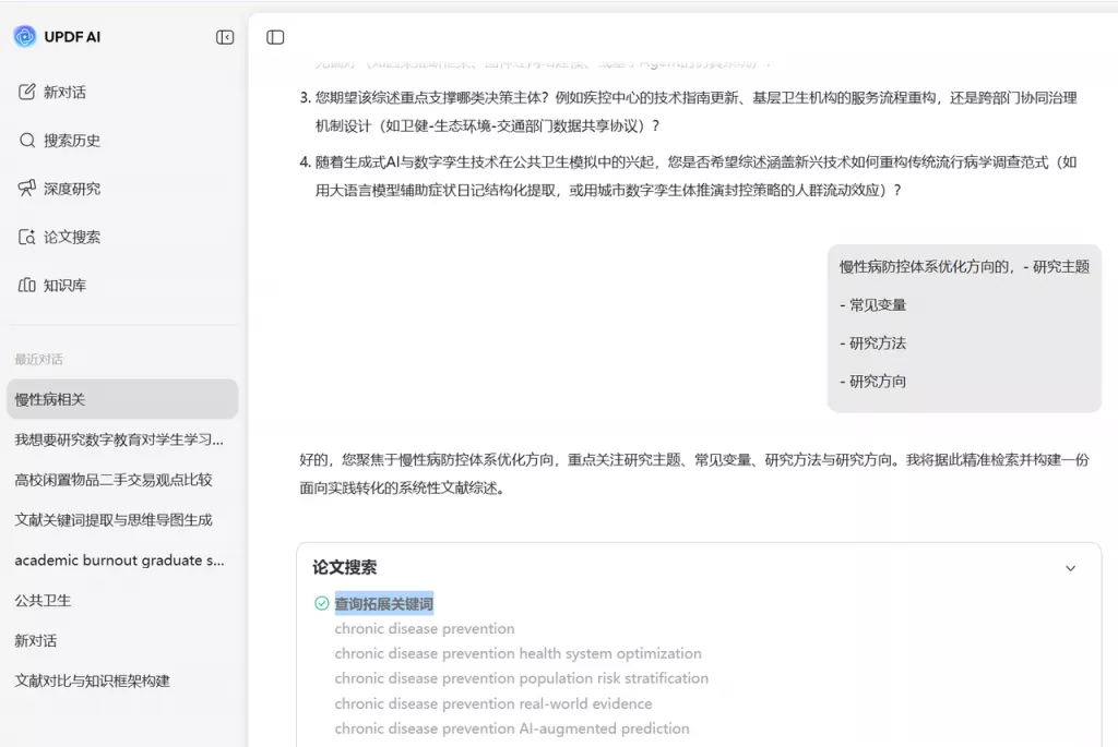 在 UPDF 中,可以将论文添加到知识库或项目对话中进行管理。这样做不仅可以集中保存同一作者的研究成果,还可以方便后续写论文综述或整理研究资料。