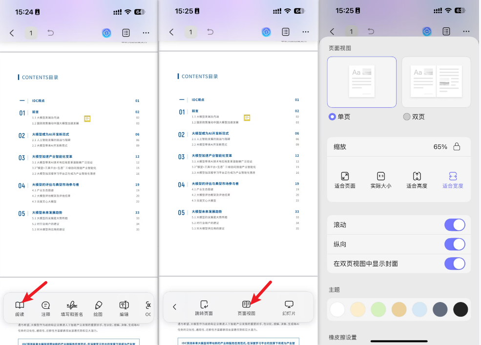 - 点击屏幕底部的阅读图标,点击页面视图,就可以看到页面视图的设置。
