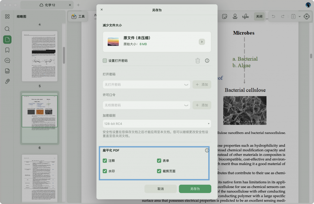 ·扁平化注释和表单元素:适用于包含注释及表单的 PDF 文档,如论文、财务表等,保证注释及表单不易被修改。