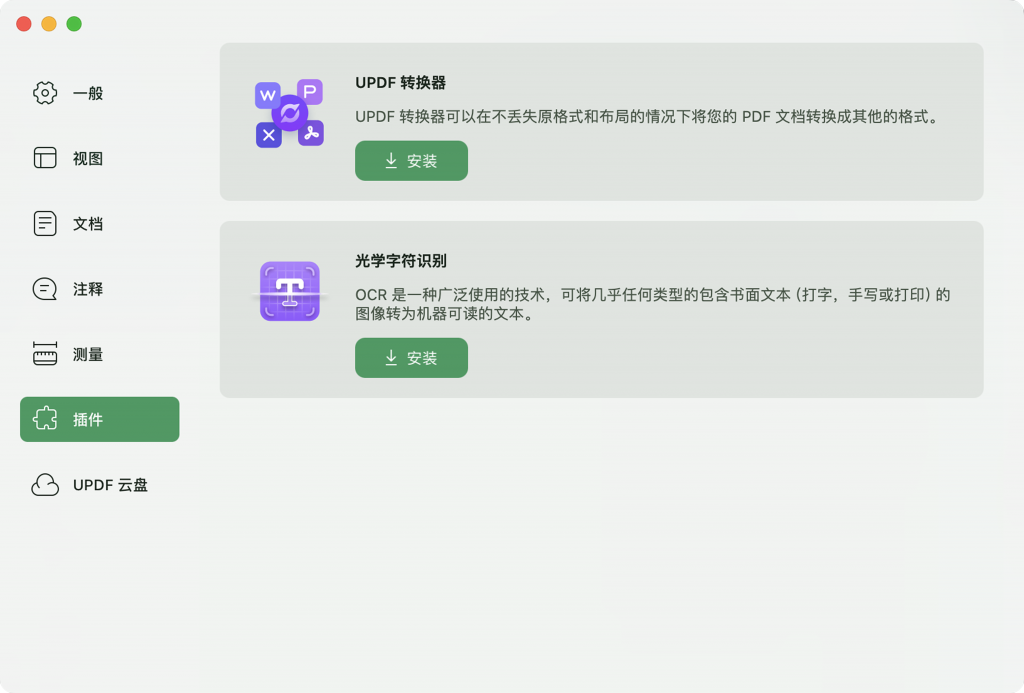 插件偏好可以让您看到 UPDF 中的插件工具,包括格式转换器和OCR光学字符识别插件,可以看到工具的介绍和状态。